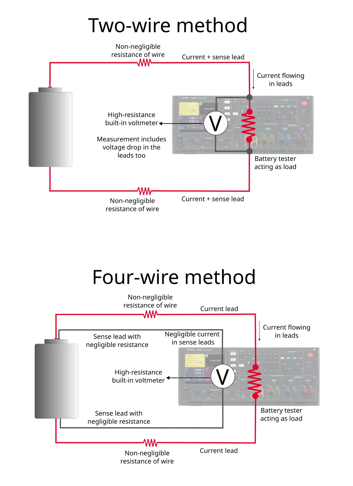 Buna karşılık, dört telli bir bağlantıda, bir çift kablo, yerleşik yüksek dirençli voltmetre ile sadece pil üzerindeki voltajı algılar, diğer çift kablo ise yük akımını iletir. Voltmetre ve algılama kablolarının yüksek direnci nedeniyle, bu kablolar üzerindeki voltaj düşüşü neredeyse sıfır olacak kadar ihmal edilebilir olacaktır. Bu şekilde hesaplanan direnç, sadece pilin direnci olacaktır.