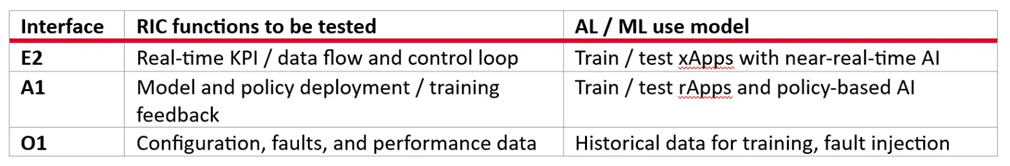 E2, A1 ve O1 gibi standart Açık RAN arayüzleri, RIC'yi test etmek ve optimize etmek için kullanılan AI / ML modellerinin gerçekçi, uçtan uca eğitimi ve doğrulanmasında kritik bir rol oynar:
