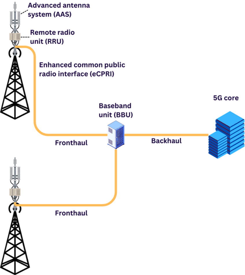 Geleneksel dağıtılmış RAN (D-RAN) dağıtımında, gNodeB (gNB) olarak adlandırılan bir 5G baz istasyonu, aşağıdaki komponentleri her hücre kulesinde eş konumlu olarak bulunduran bir mantıksal alt sistemdir: