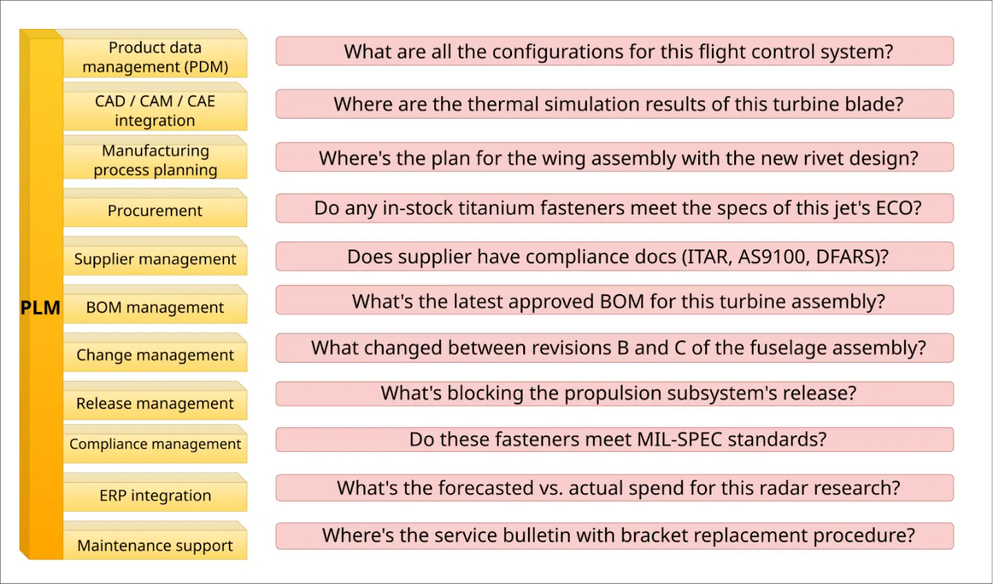 PLM, bir ürünün mühendislik, tasarım, üretim ve operasyonel yönleriyle ilgili kurumsal çapta tek doğru bilgi kaynağıdır. Uçaklar, uydular ve savunma sistemleri karmaşık yazılım, elektronik ve mekanik alt sistemlerle giderek daha sofistike hale geldikçe, geliştirme sürecinde birbiriyle bağlantılı bir yaklaşım benimsenmesi hayati önem kazanmaktadır. PLM sistemleri, ürünle ilgili tüm bu verileri ve süreçleri yönetmenin temelini oluşturur.