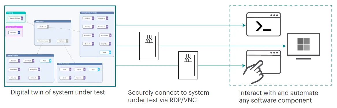 Eggplant'ın black-box non-invazif yaklaşımı, özellikle güvenli A&D ortamları için önemli bir fark yaratır. Özellikleri doğrudan kullanıcı arayüzü üzerinden test eder ve bir insan kullanıcı gibi uygulamalarla görsel olarak etkileşime girer. Nesne (veya API) katmanı, kaynak kodu veya dahili uygulama yapılarına herhangi bir bağlantıya ihtiyaç duymadan çalışır.