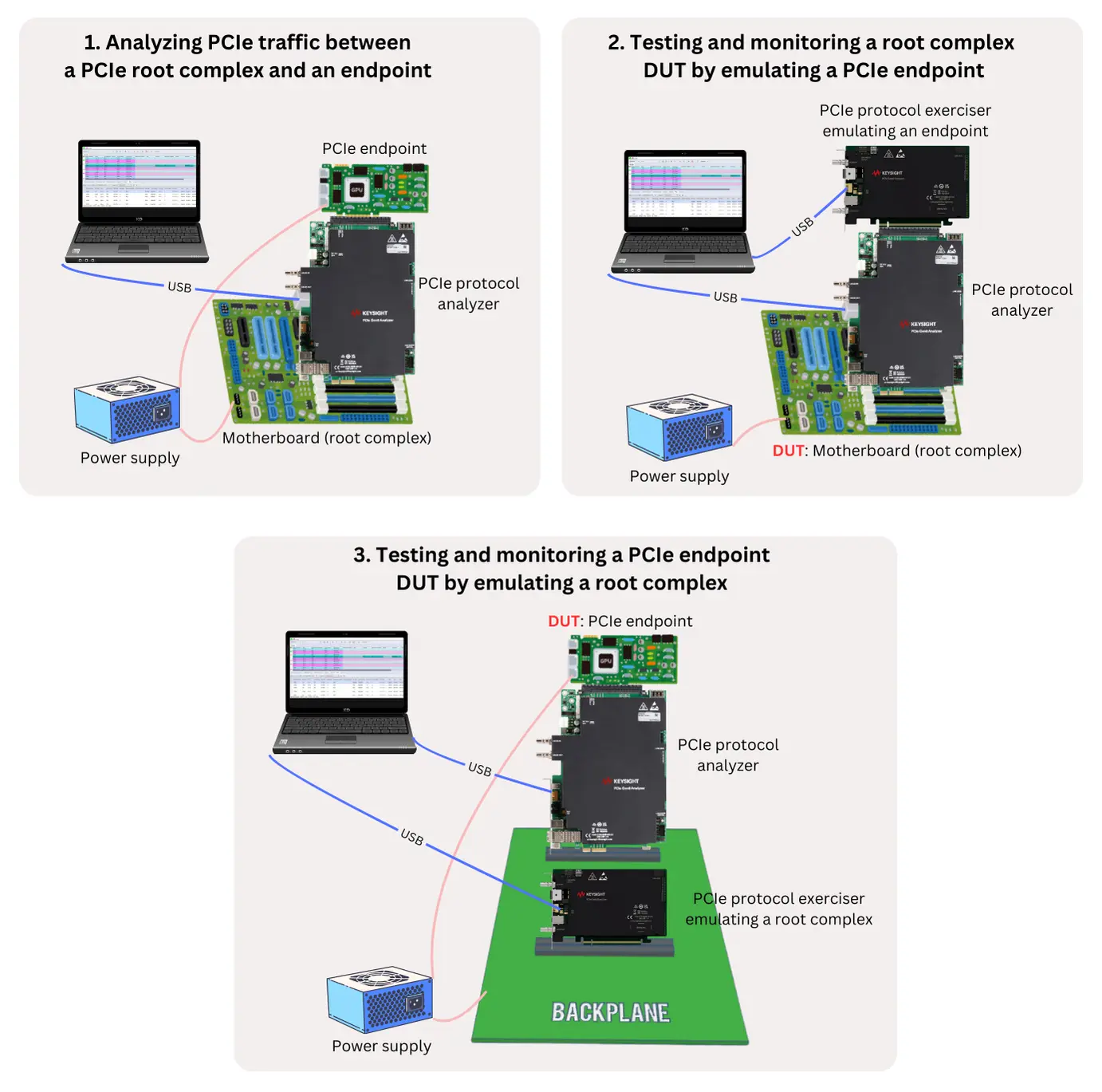 PCIe protokol analizörleri ve egzersiz cihazları, birçok olası aygıt topolojisinin test edilmesini sağlar.