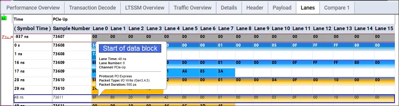 Bağlantı kurulduktan sonra, şerit görünümü, burada gösterildiği gibi her PCIe şeridinde gönderilen tam sembolleri ve bunların iki bitlik dizilerini göstererek düşük seviyeli veri iletimi hakkında bilgi verir.